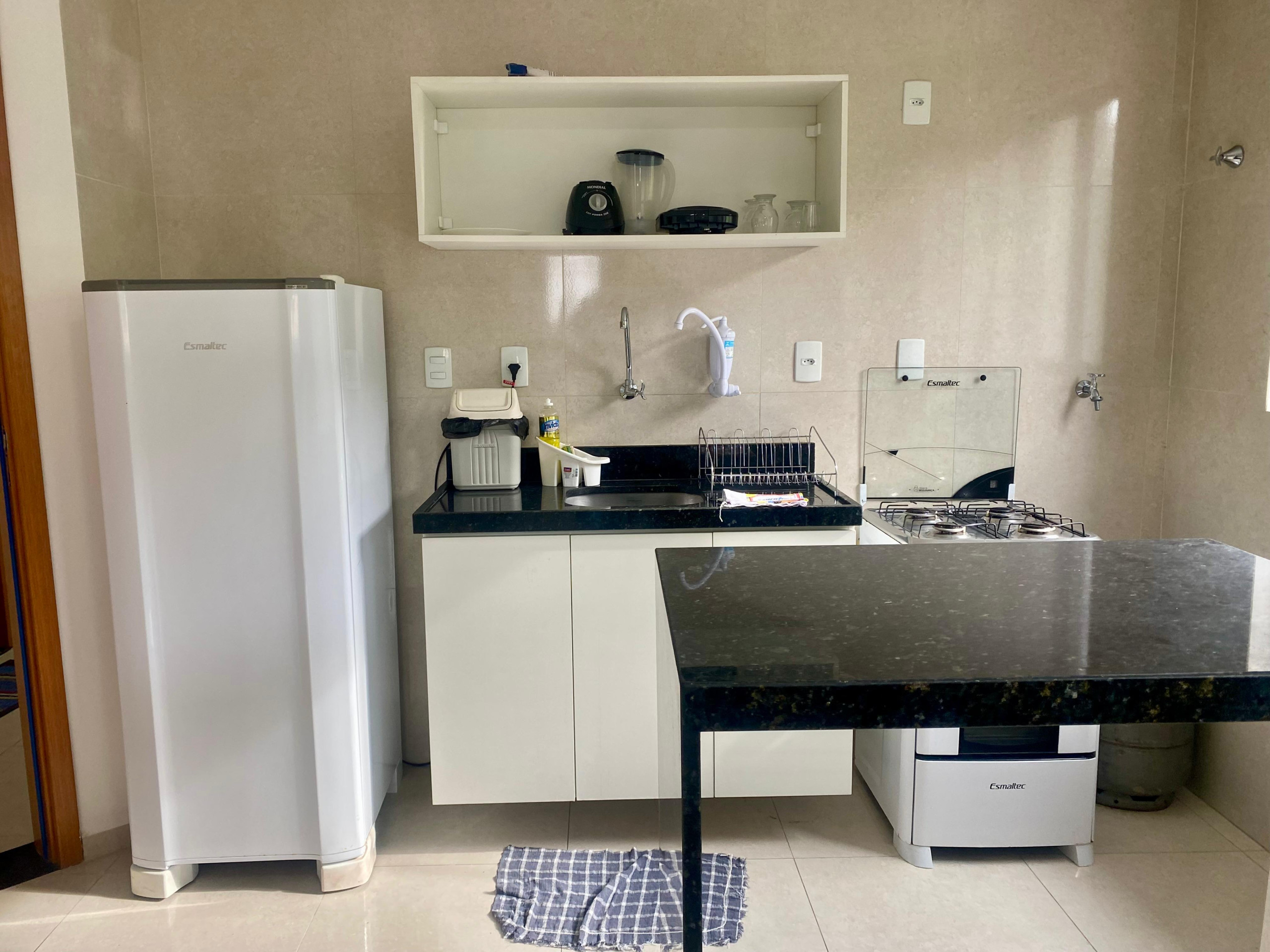 A cozinha americana, de gás, está equipada com geladeira, louça/talheres, utensílios/cozinha e liquidificador.