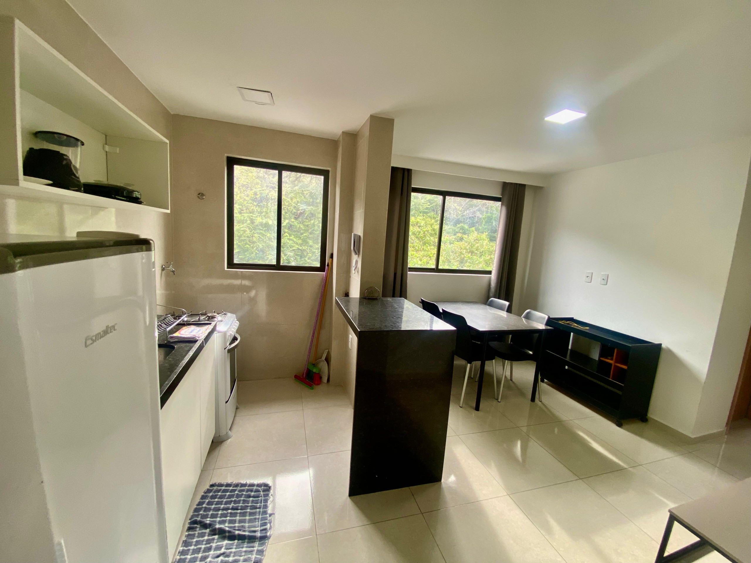 O flat é novo e confortável, com 21m² de espaço, 10m² de terraço e linda vista para o mar e o jardim. O condomínio possui sala de jogos (sinuca, mesa de xadrez), academia e piscina comunitária. O apartamento possui um quarto, com capacidade para duas pessoas, e uma cozinha americana totalmente equipada. O flat também possui elevador, um lindo jardim, terreno cercado, acesso à internet (wifi), ar-condicionado, garagem e uma televisão com TV a cabo.