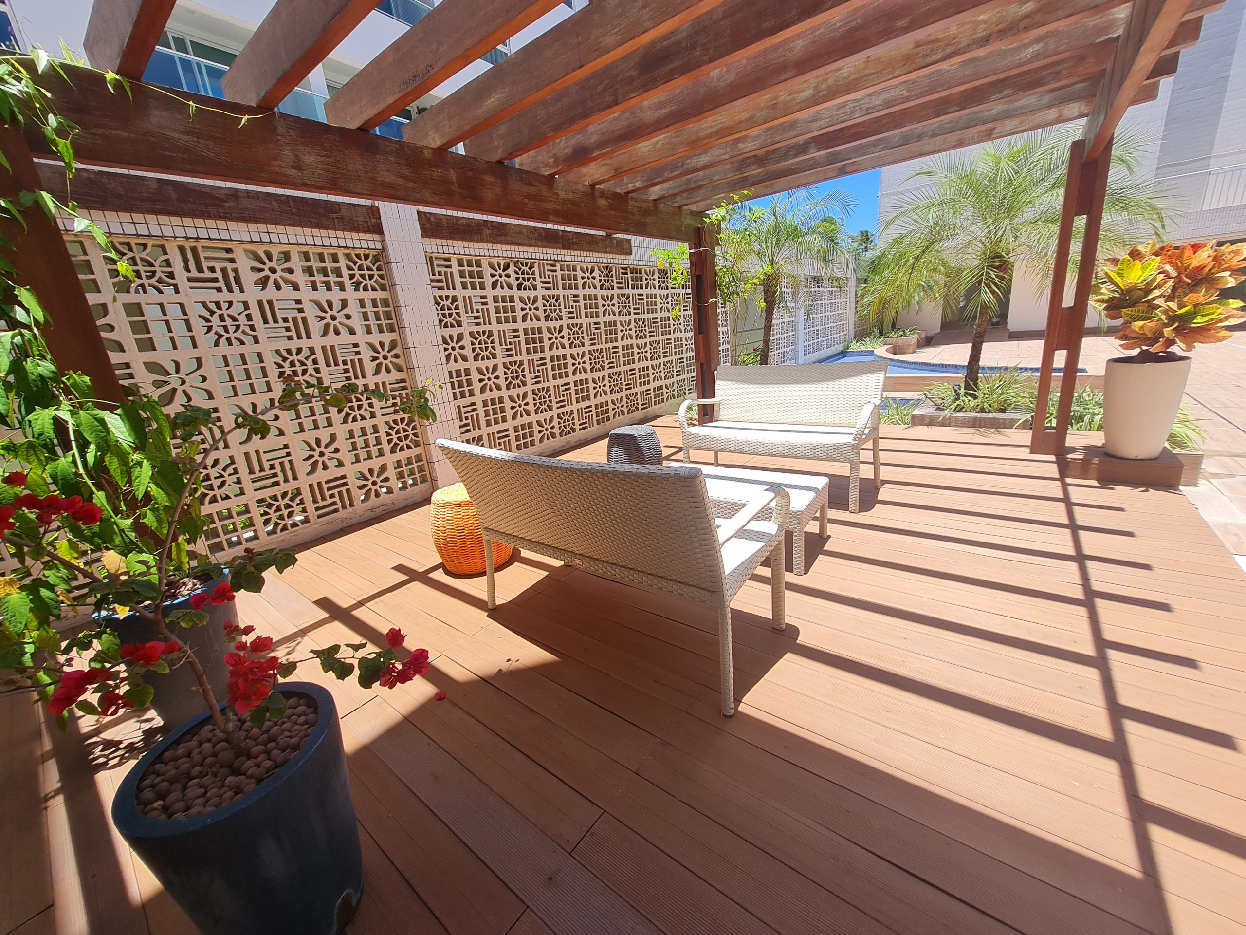 O flat é novo e confortável, com 21m² de espaço, 10m² de terraço e linda vista para o mar e o jardim. O condomínio possui sala de jogos (sinuca, mesa de xadrez), academia e piscina comunitária. O apartamento possui um quarto, com capacidade para duas pessoas, e uma cozinha americana totalmente equipada. O flat também possui elevador, um lindo jardim, terreno cercado, acesso à internet (wifi), ar-condicionado, garagem e uma televisão com TV a cabo.