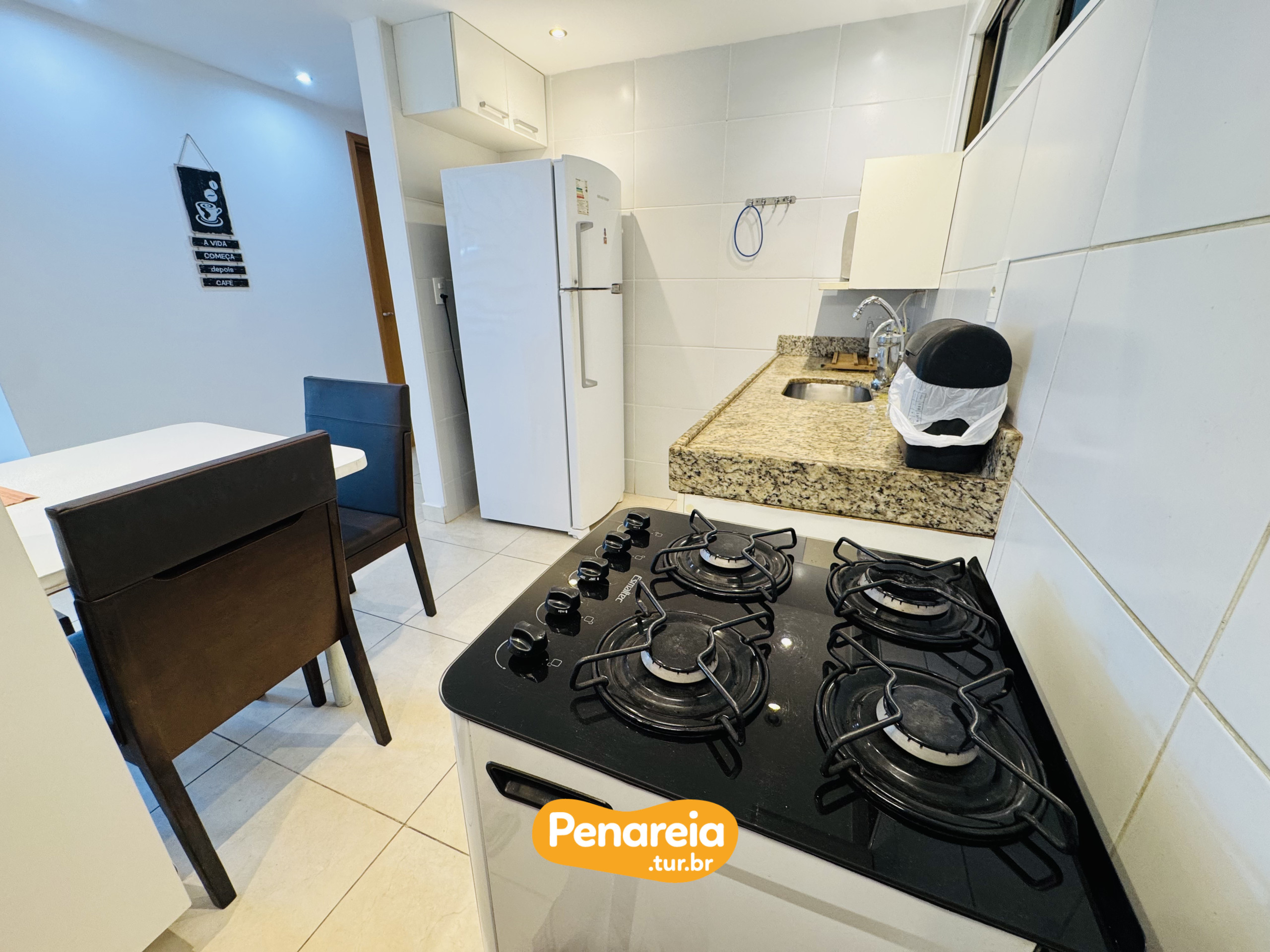 A cozinha americana, de gás, está equipada com geladeira, micro-ondas, congelador, utensílios/cozinha, cafeteira, fritadeira, torradeira e liquidificador.