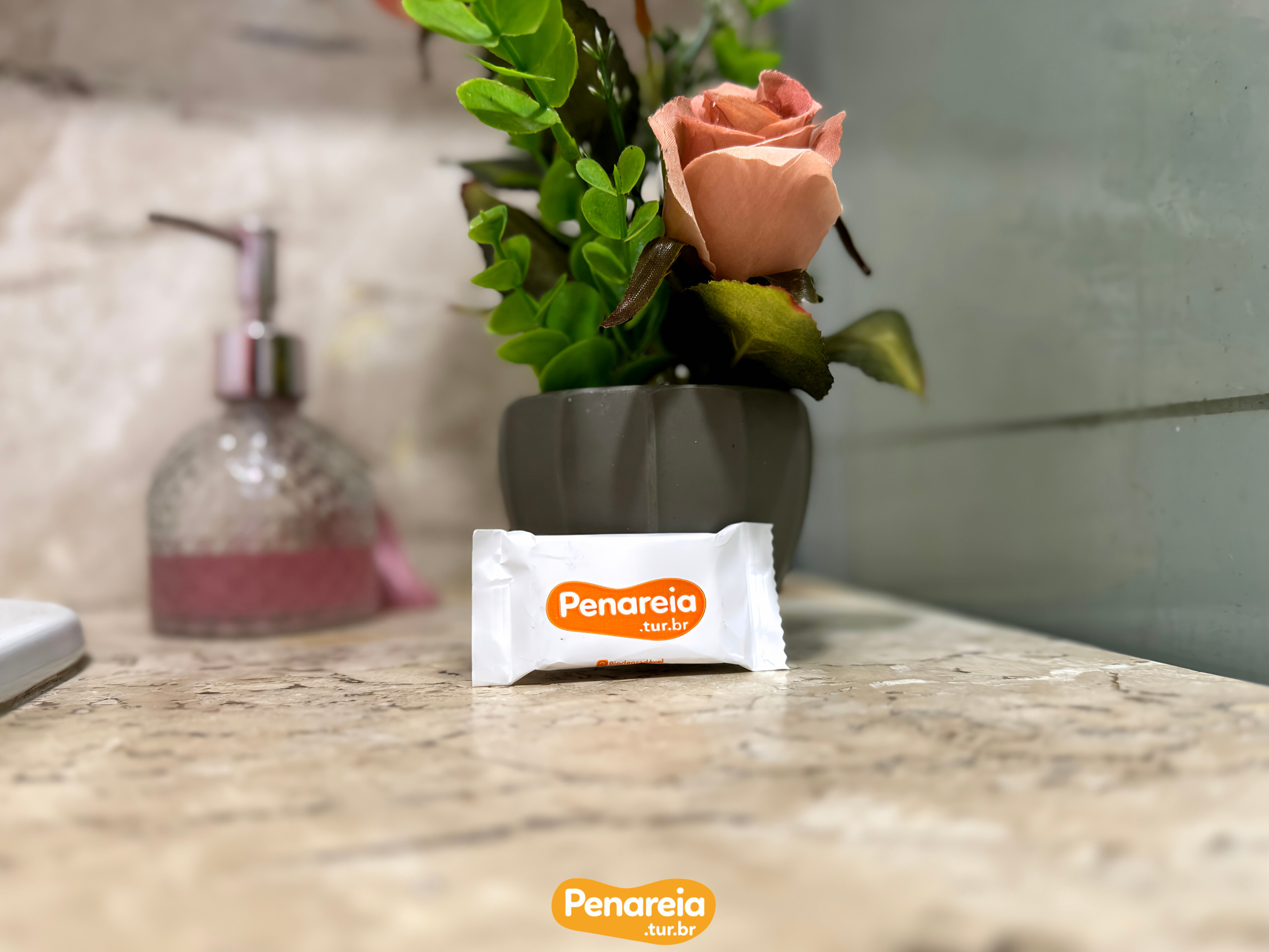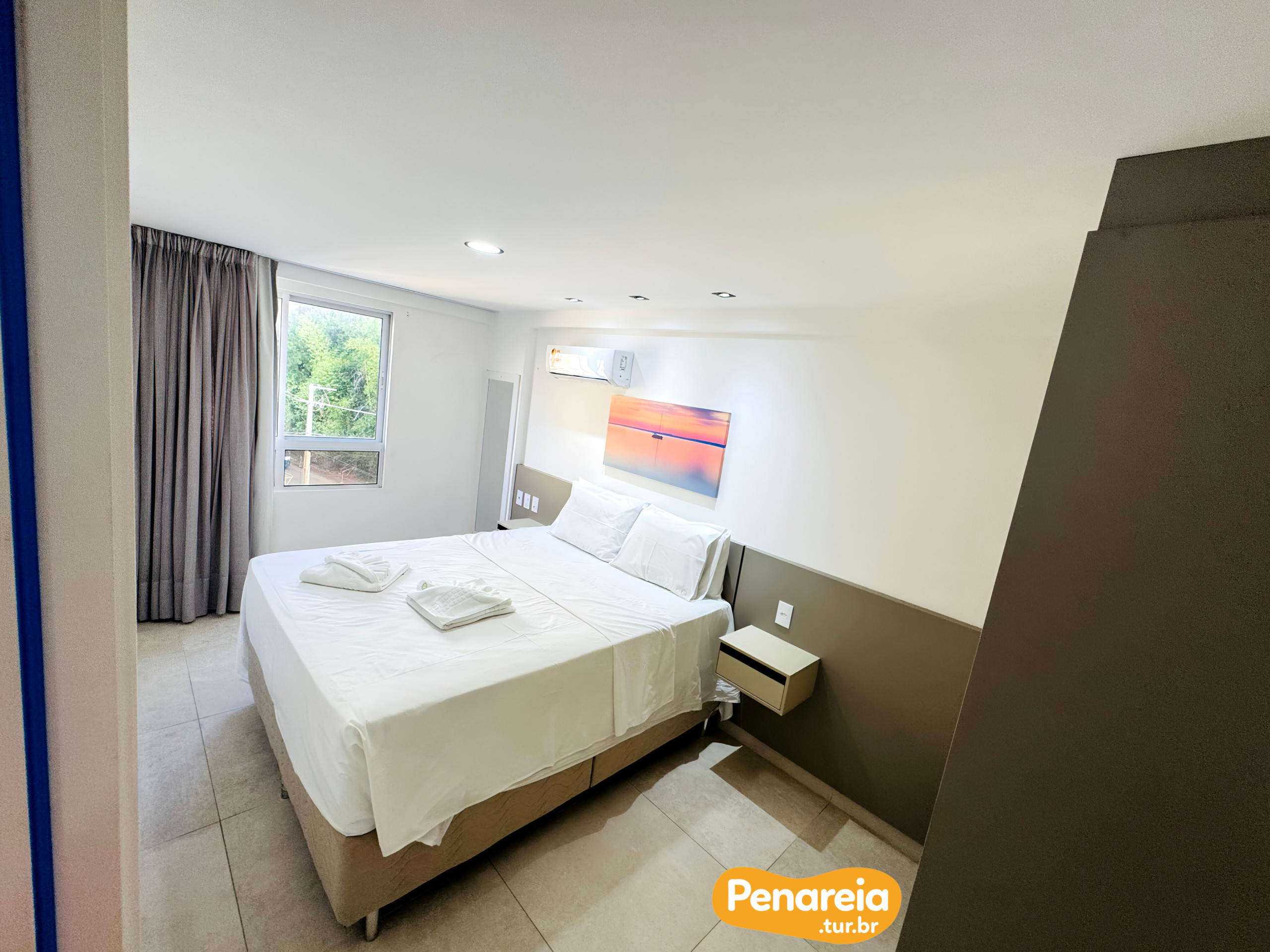O espaço conta com um quarto elegante equipado com uma cama de casal queen size e uma cama adicional, permitindo acomodar confortavelmente até 3 pessoas. A luminosidade e o design contemporâneo criam um ambiente tranquilo perfeito para descansar após um dia de praia.