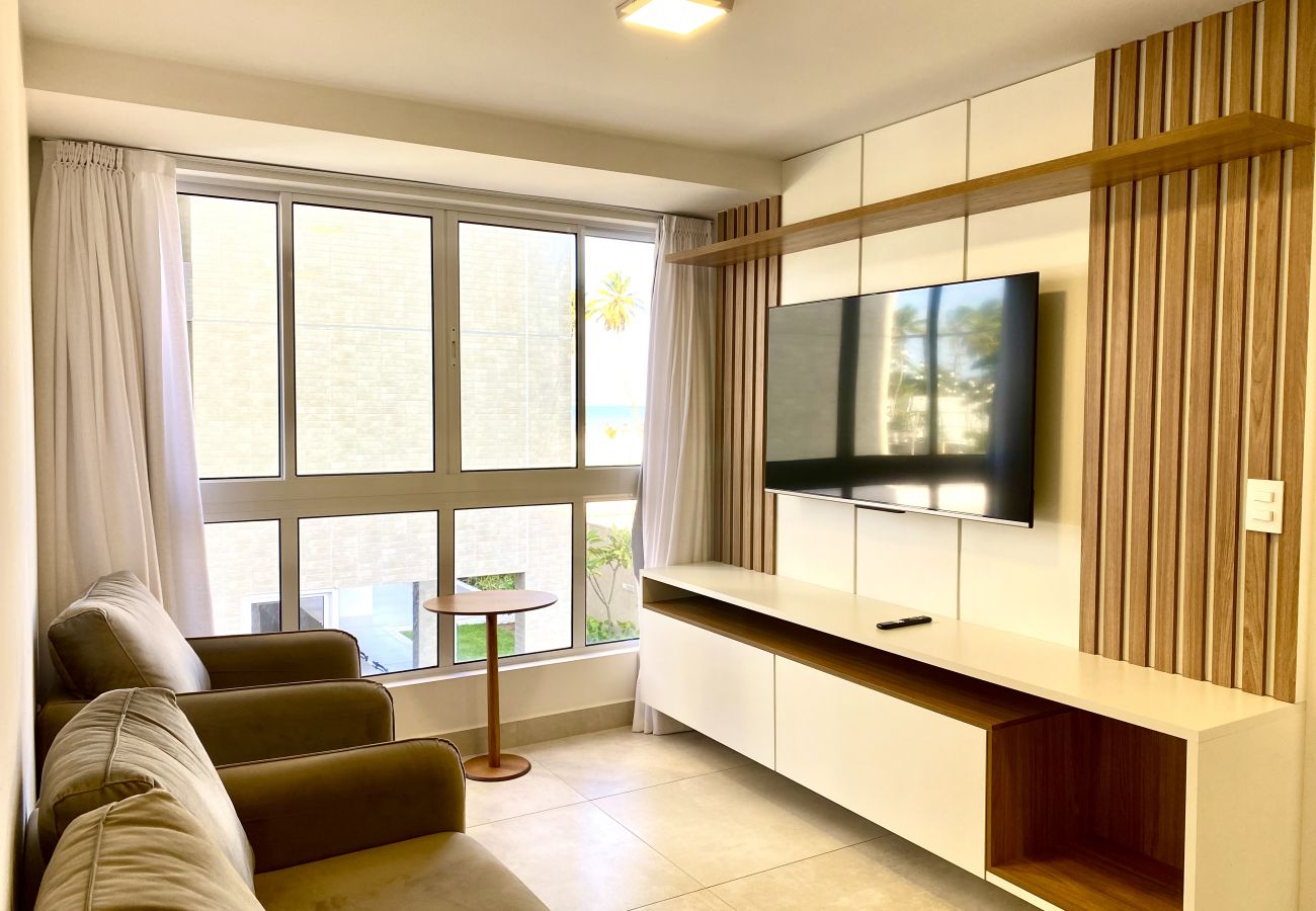O flat é novo e confortável, com 30m² de espaço, 10m² de terraço e linda vista para o mar e o jardim. O condomínio possui sala de jogos (sinuca, mesa de xadrez), academia e piscina comunitária. O apartamento possui um quarto, com capacidade para duas pessoas, e uma cozinha americana totalmente equipada. O flat também possui elevador, um lindo jardim, terreno cercado, acesso à internet (wifi), ar-condicionado, garagem e uma televisão com TV a cabo.