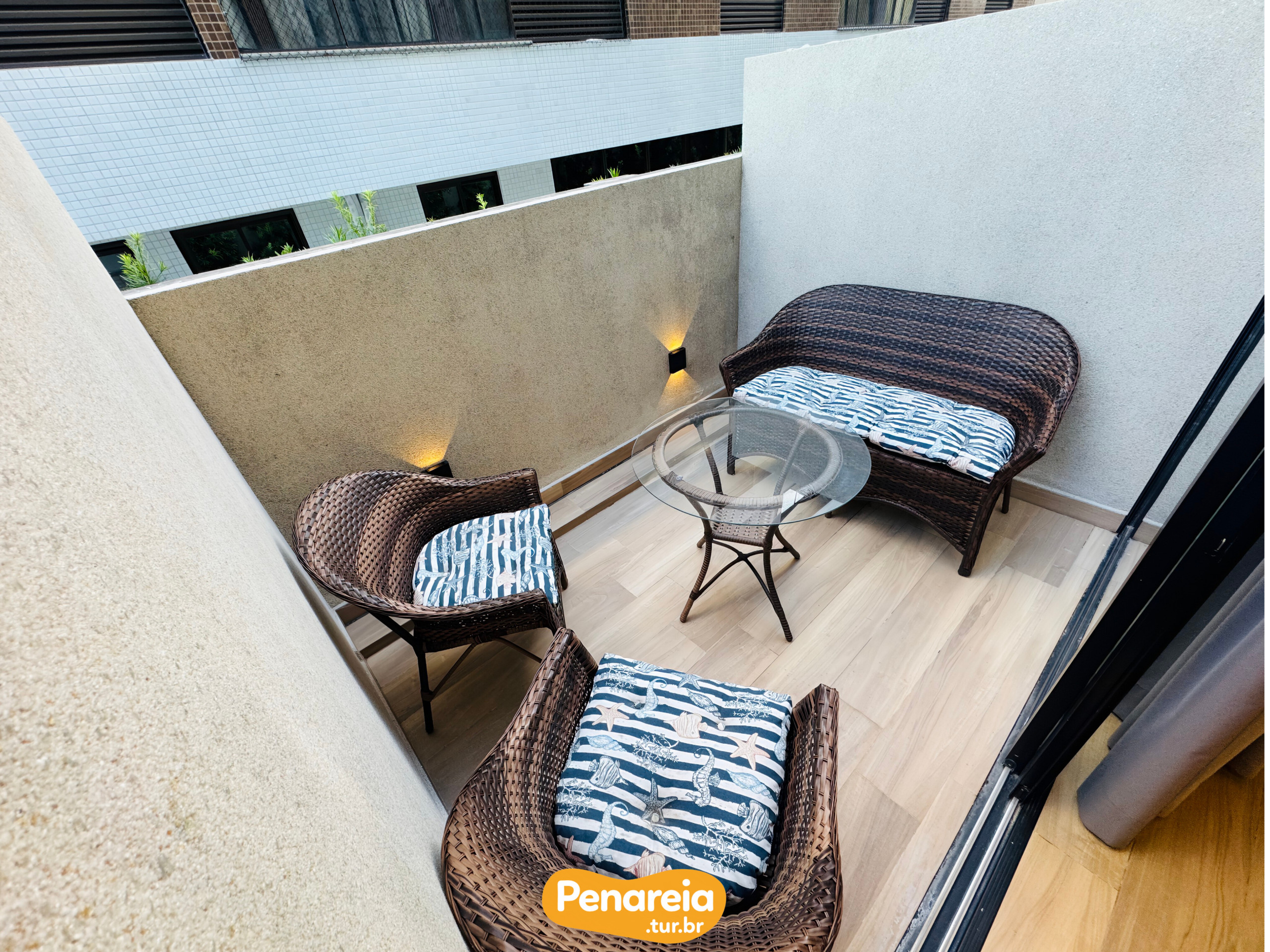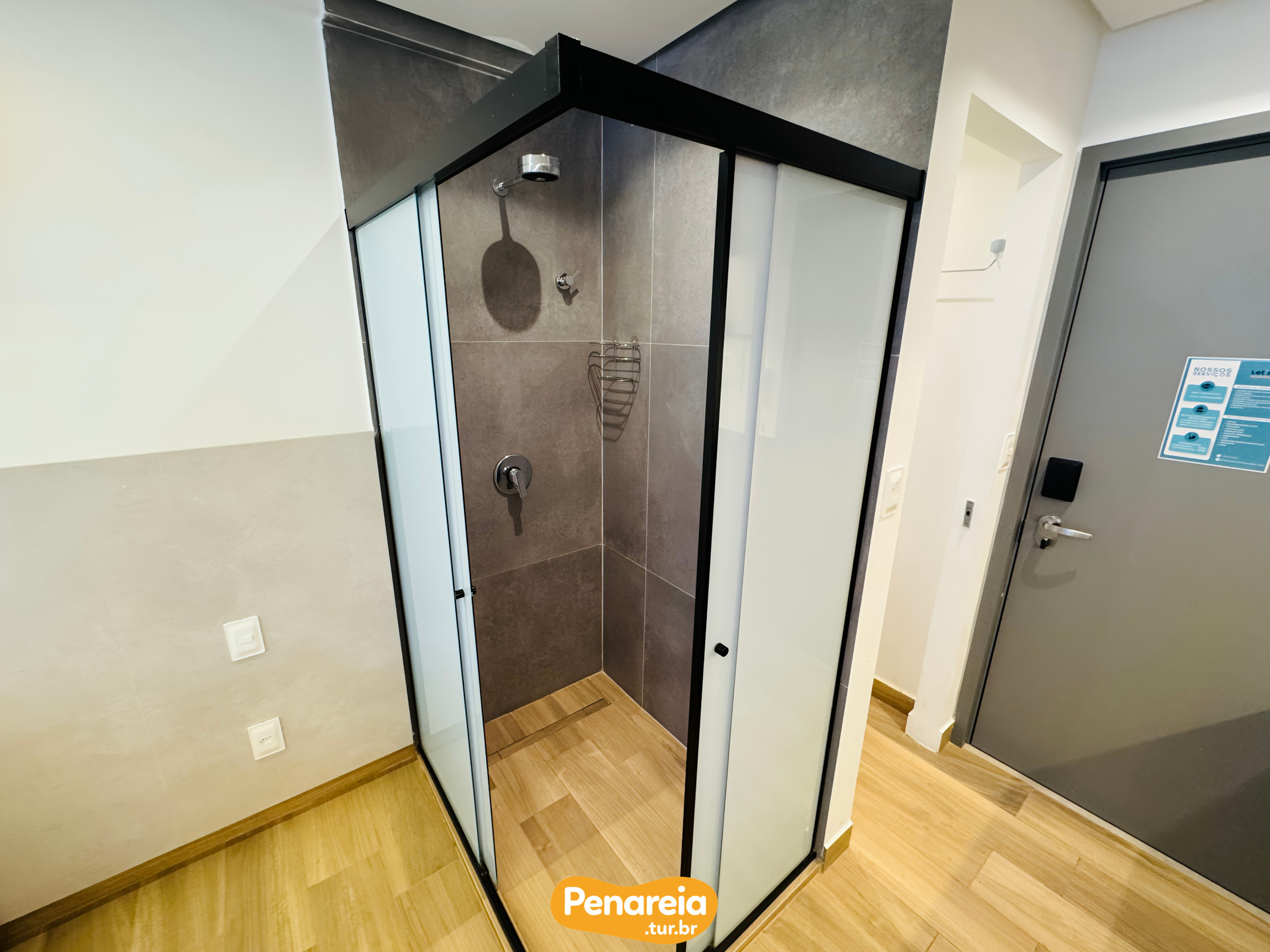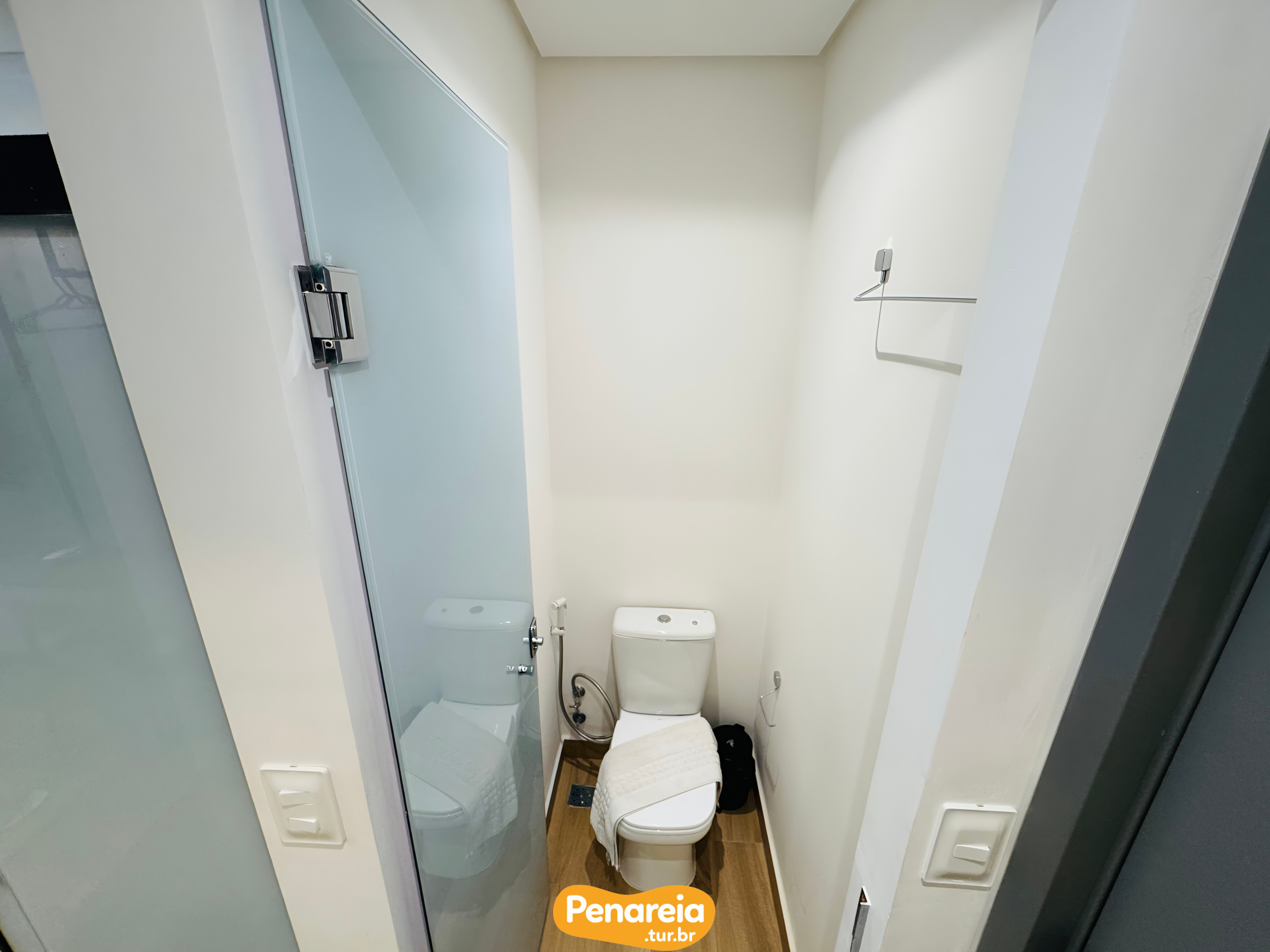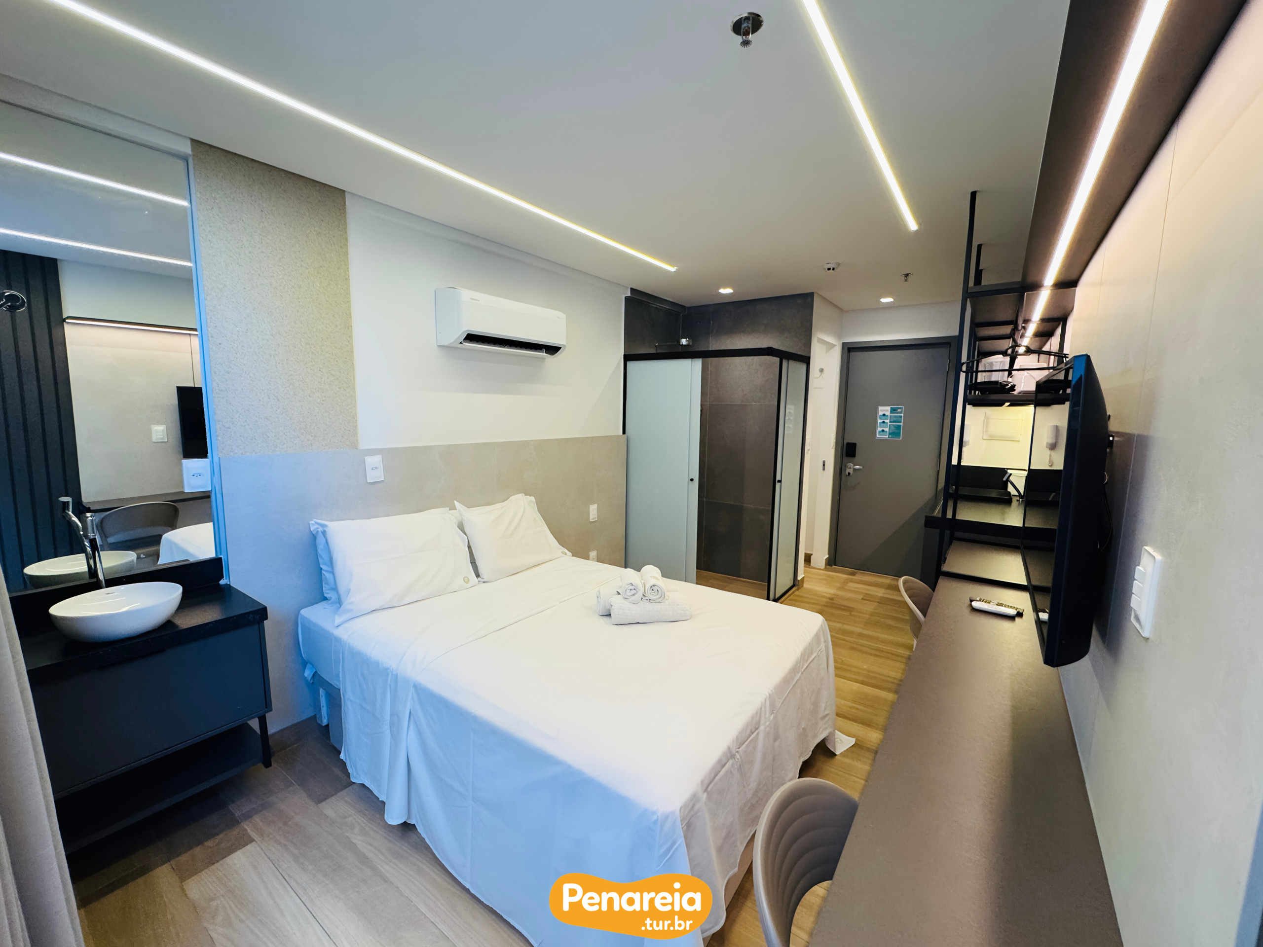 O espaço conta com um quarto elegante equipado com uma cama de casal queen size e uma cama adicional, permitindo acomodar confortavelmente até 3 pessoas. A luminosidade e o design contemporâneo criam um ambiente tranquilo perfeito para descansar após um dia de praia.
