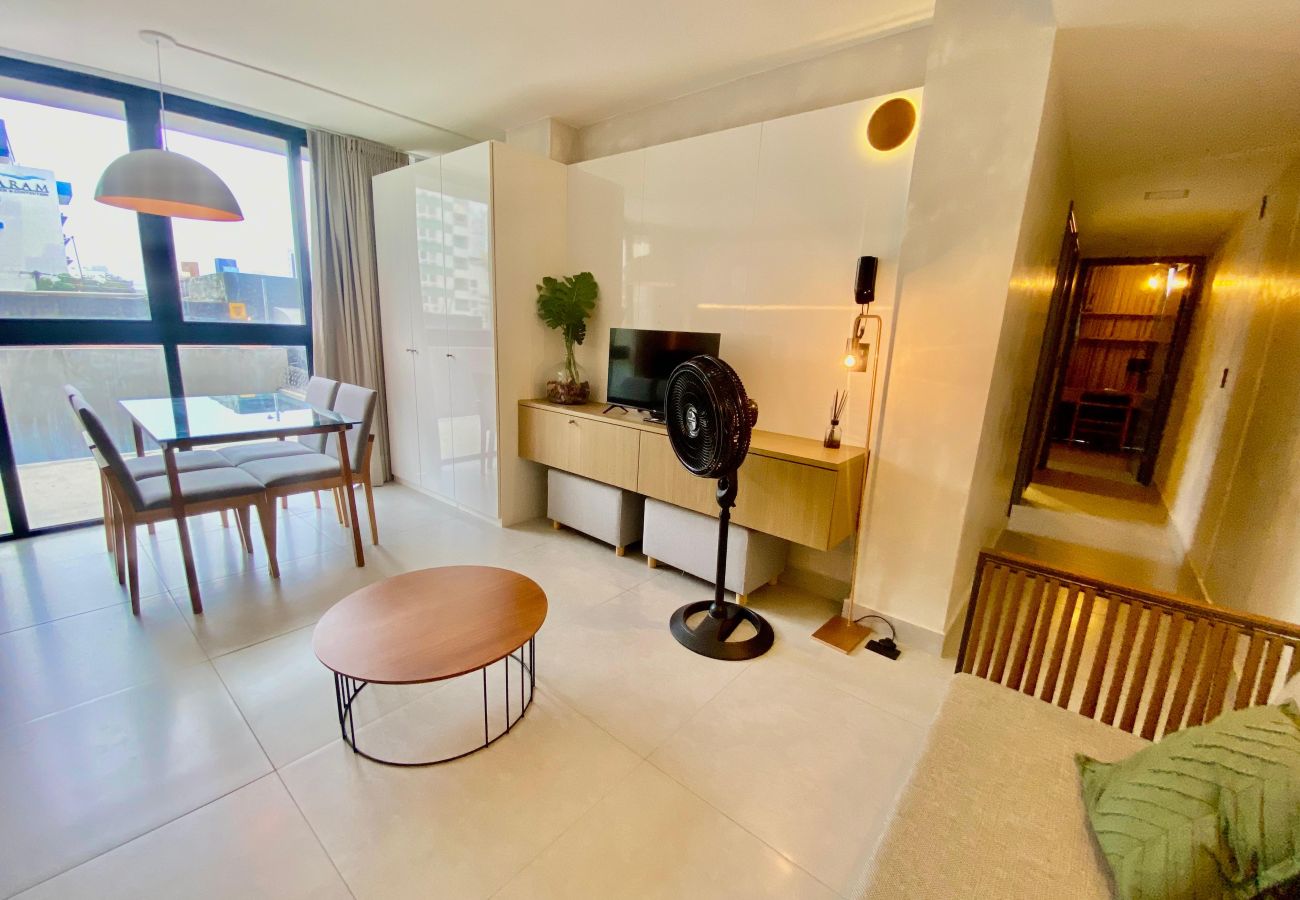 The apartment in João Pessoa has 2 bedrooms and has capacity for 5 people (max. 4 adults). The apartment is homely, is modern, and is 49 m². The property is located 0 m from the rock beach, 200 m from Praia de Tambaú sand beach. The house is situated in a family-friendly neighborhood in a residential complex.The accommodation is equipped with the following items: lift, garden, garden furniture, fenced garden, internet (Wi-Fi), gym / fitness centre, air conditioning in all bedrooms, communal swimming pool, covered parking the same building, 1 TV.In the gas open plan kitchen, refrigerator, microwave, oven, freezer, dishes/cutlery, kitchen utensils, coffee machine, frying pan and juicer are provided.
