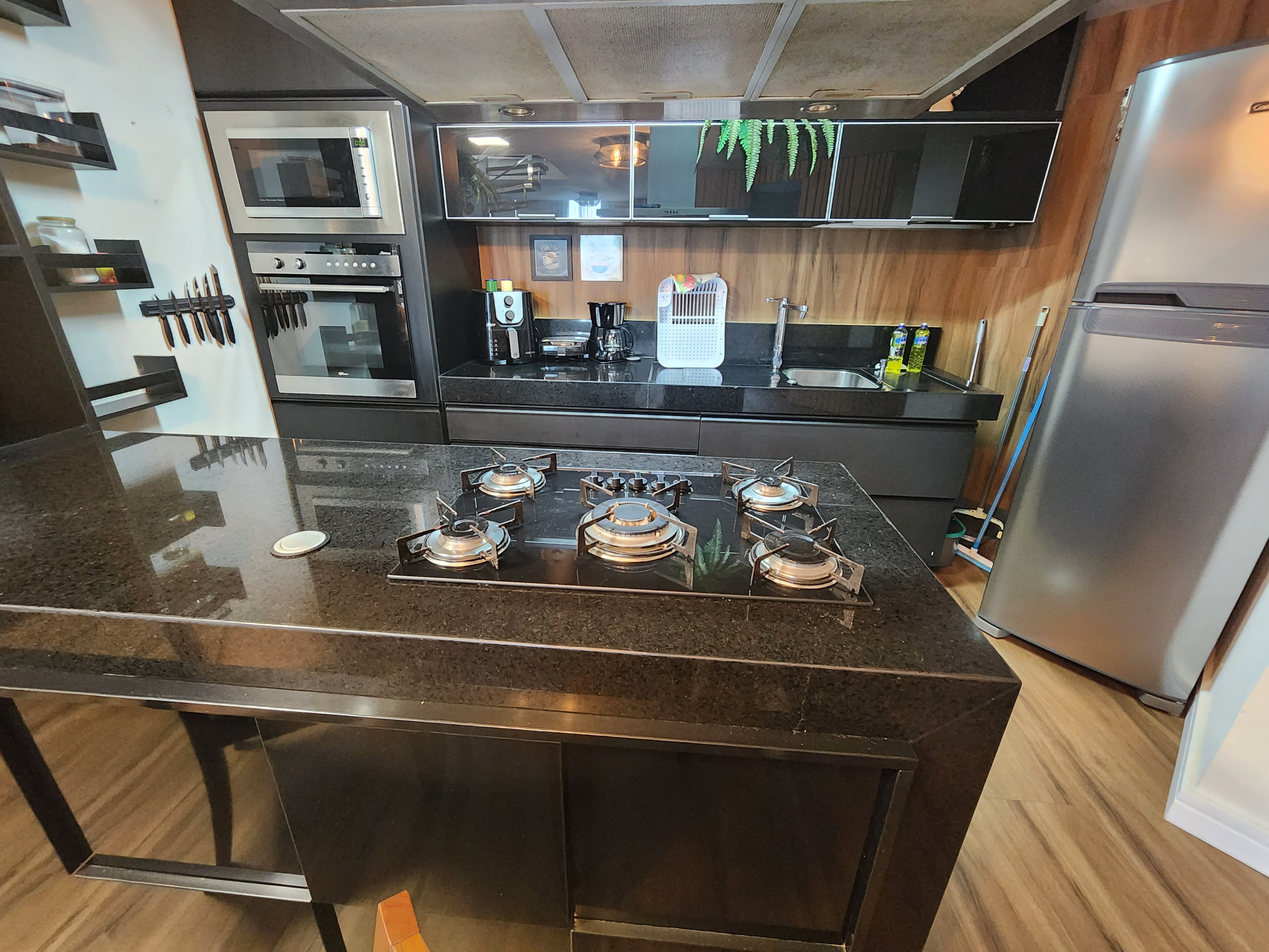 La cuisine américaine, à gaz, est équipée avec réfrigérateur, micro-ondes, congélateur, vaisselle/couverts, ustensiles/cuisine, cafetière, friteuse, grille pain et presse-agrumes.