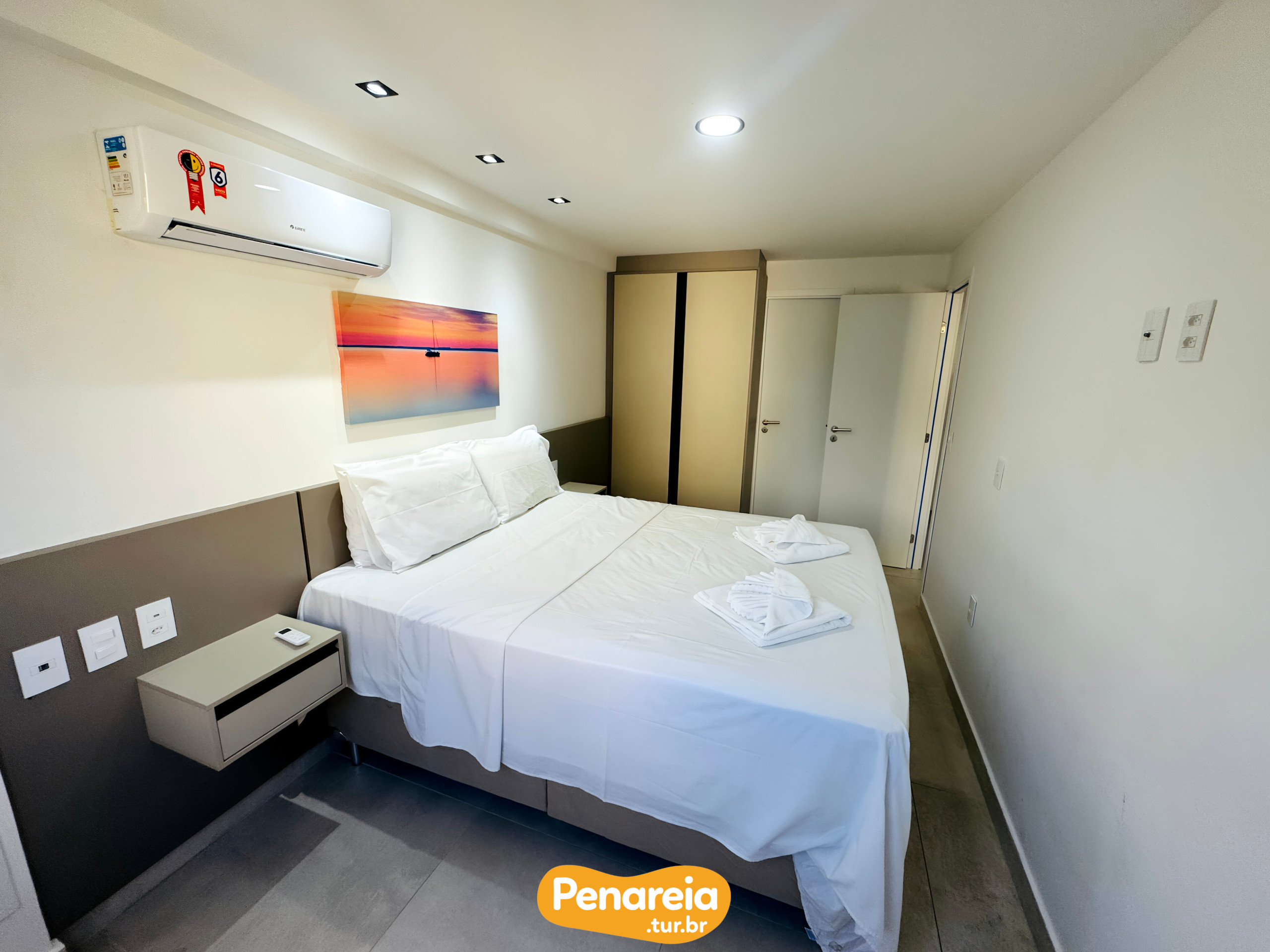 O espaço conta com um quarto elegante equipado com uma cama de casal queen size e uma cama adicional, permitindo acomodar confortavelmente até 3 pessoas. A luminosidade e o design contemporâneo criam um ambiente tranquilo perfeito para descansar após um dia de praia.