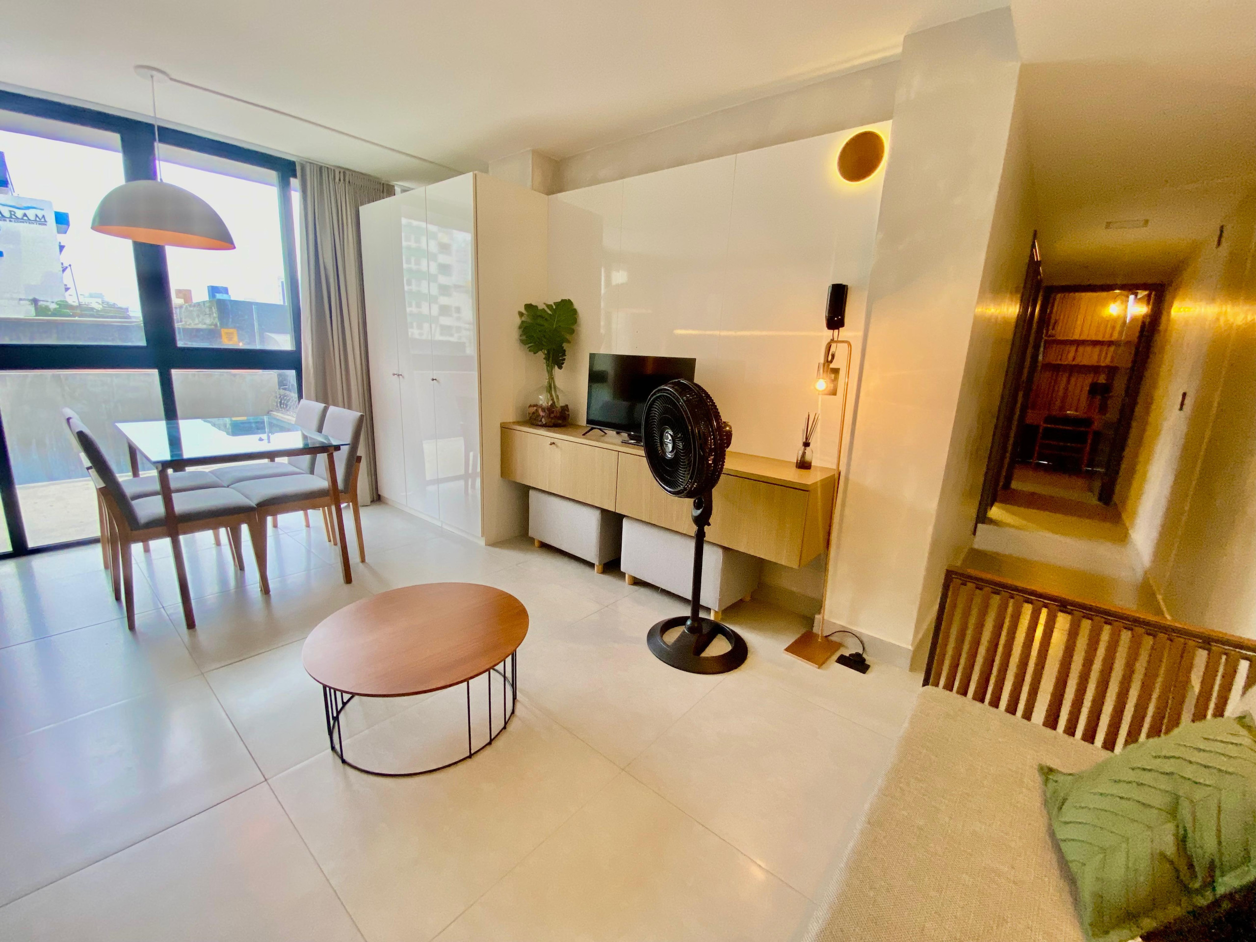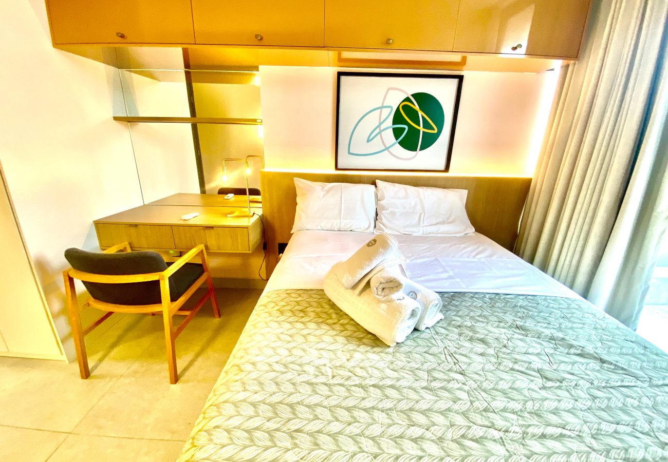O flat é novo e confortável, com 30m² de espaço, 10m² de terraço e linda vista para o mar e o jardim. O condomínio possui sala de jogos (sinuca, mesa de xadrez), academia e piscina comunitária. O apartamento possui um quarto, com capacidade para duas pessoas, e uma cozinha americana totalmente equipada. O flat também possui elevador, um lindo jardim, terreno cercado, acesso à internet (wifi), ar-condicionado, garagem e uma televisão com TV a cabo.