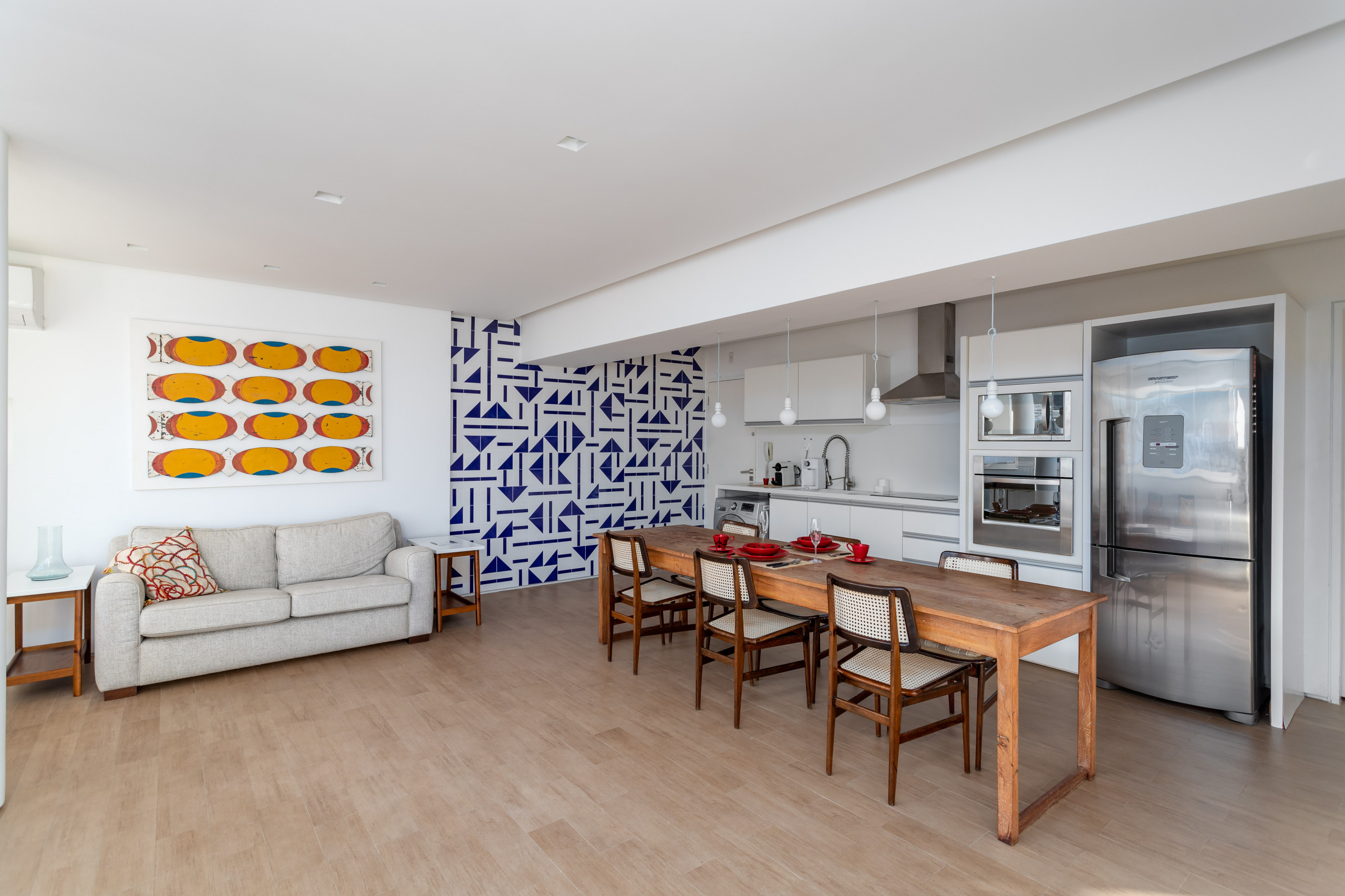 A kitchenette, de inducção, está equipada com frigorífico, microondas, forno, congelador, louça/talheres e máquina de café.