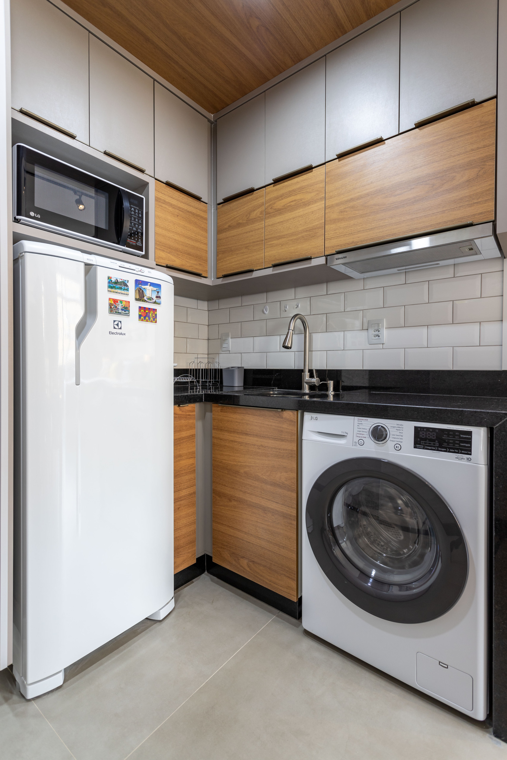A kitchenette, de mista: gás e eléctrica, está equipada com frigorífico, microondas, congelador, louça/talheres, máquina de café, máquina de sumos, fogão, pratos e tigelas.